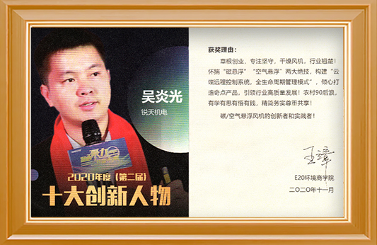 1、雷茨總經(jīng)理吳炎光榮獲環(huán)境商學(xué)院2020屆“十大創(chuàng)新人物”,傾心打造奇點產(chǎn)品“空氣懸浮風(fēng)機”和“磁懸浮風(fēng)機”;