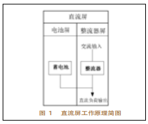 2直流屏作業(yè)原理圖1為直流屏作業(yè)原理簡圖。在圖1中,蓄電池和整流器組成了變電站的直流屏,當有交流輸入電源時,整流器作業(yè),把交流電整流成直流電,與蓄電池一起協(xié)作,供應直流負荷安穩(wěn)的直流電源。