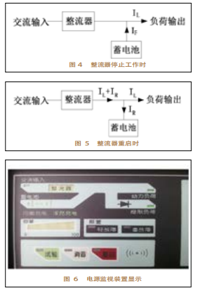 (4)當從停電狀態(tài)到電源康復供電時,整流器再次發(fā)動,此刻整流器既要向負荷輸出供電,同時還要向蓄電池充電,補充蓄電池消耗的電能,直至蓄電池充電結束。如圖5所示。