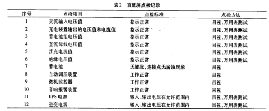 首要需求編制點(diǎn)檢標(biāo)準(zhǔn),編制出符合實(shí)際出產(chǎn)需求的點(diǎn)檢標(biāo)準(zhǔn),使其他點(diǎn)檢者能快速、簡潔履行點(diǎn)檢標(biāo)準(zhǔn)。點(diǎn)檢標(biāo)準(zhǔn)的內(nèi)容觸及方面比較多,列入點(diǎn)檢處理規(guī)模的部位也比較多,例如直流屏,交流輸入電壓值、充電設(shè)備輸出的電壓值和電流值、蓄電池組電壓值、直流母線電壓值、浮充電流值、絕緣電壓值、蓄電池、主動調(diào)壓設(shè)備、微機(jī)監(jiān)控器、音響報警設(shè)備、UPS電源、逆變電源等都是關(guān)系到直流屏安全作業(yè)的重要參數(shù)及設(shè)備,確認(rèn)為點(diǎn)檢部位。點(diǎn)檢部位確認(rèn)后,就要履行點(diǎn)檢內(nèi)容,點(diǎn)檢辦法現(xiàn)在還是以簡單東西、儀器和人的感觀為主的點(diǎn)檢辦法。因而,點(diǎn)檢內(nèi)容首要是檢查設(shè)備溫度、電壓、表計(jì)指示、作業(yè)情況等方面參數(shù)。直流屏設(shè)備點(diǎn)檢作業(yè)首要是以日常點(diǎn)檢為主,守時點(diǎn)檢為輔。日常點(diǎn)檢首要以人的感官為主,通過聽、摸、看.擰等辦法對作業(yè)中的設(shè)備進(jìn)行一個外觀的檢查。通過每日進(jìn)行的點(diǎn)檢作業(yè),及時發(fā)現(xiàn)設(shè)備存在的風(fēng)險并消除,使設(shè)備長周期安全作業(yè)。由于直流屏的特殊性,展開的直流屏設(shè)備專業(yè)點(diǎn)檢也很重要,點(diǎn)檢辦法以工用具、表面和人的感觀為主的點(diǎn)檢辦法。通過守時進(jìn)行的點(diǎn)檢作業(yè),及時發(fā)現(xiàn)設(shè)備存在的風(fēng)險并消除,使設(shè)備長周期安全作業(yè),見表2。