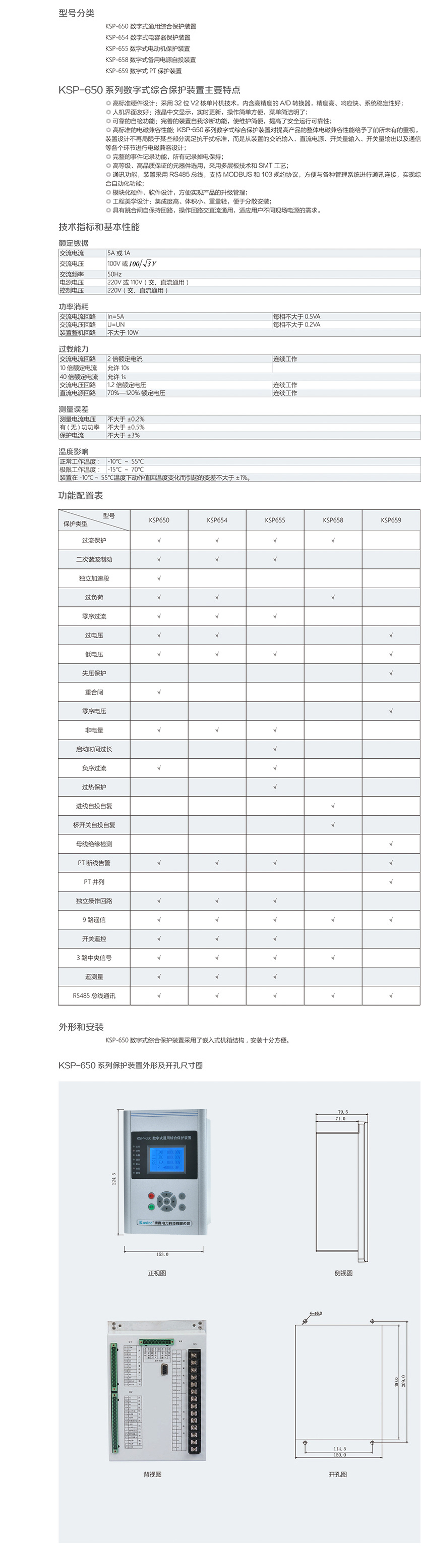 KSP-650 系列數(shù)字式保護(hù)裝置,是我公司最新推出的一款實(shí)用型綜 合保護(hù)裝置。裝置功能齊全,運(yùn)行穩(wěn)定,采用通用型一體化設(shè)計(jì)理 念,具備保護(hù)、測(cè)量、控制、通訊完備的功能,廣泛適用于 35kV 及 以下電壓等級(jí)變配電站、開閉所等場(chǎng)合。新穎的結(jié)構(gòu)設(shè)計(jì),外觀時(shí)尚, 結(jié)構(gòu)精巧,既適用于安裝在中置柜內(nèi),也可方便安裝于柜體體積狹 小的環(huán)網(wǎng)柜等各種柜體。
